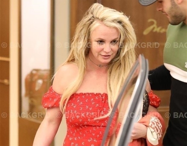 Britney usava um vestido curto vermelho com ombros à mostra. Segundo o site TMZ, não havia sinal dos filhos da cantora, Sean e Jayden James. Ela e o namorado teriam passado a Páscoa no hotel juntos.