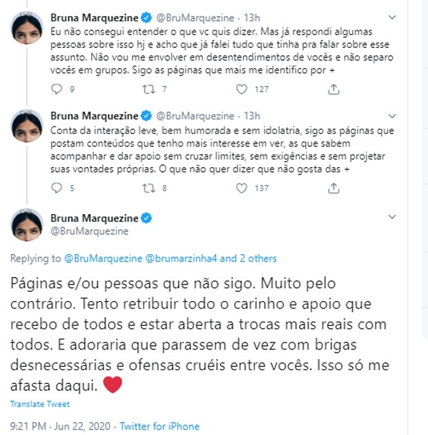 "Não vou me envolver em desentendimentos de vocês e não separo vocês em grupos. Sigo as páginas que mais me identifico por conta da interação leve, bem humorada e sem idolatria, sigo as páginas que postam conteúdos que tenho mais interesse em ver, as que sabem acompanhar e dar apoio sem cruzar limites, sem exigências e sem projetar suas vontades próprias. O que não quer dizer que não gosta das páginas e/ou pessoas que não sigo. Muito pelo contrário. Tento retribuir todo o carinho e apoio que recebo de todos e estar aberta a trocas mais reais com todos. E adoraria que parassem de vez com brigas desnecessárias e ofensas cruéis entre vocês. Isso só me afasta daqui", escreveu Bruna.