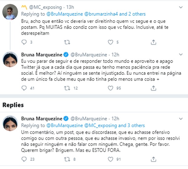 Questionada por um internauta sobre quais perfis deveria seguir, Bruna disse que apagaria o Twitter. "Eu vou parar de seguir e de responder todo mundo e aproveito e apago Twitter já que a cada dia que passa eu tenho menos paciência pra rede social. É melhor? Aí ninguém se sente injustiçado. Eu nunca entrei na página de um único fã clube meu que não tinha pelo menos uma coisa, um comentário, um post, que eu discordasse, que eu achasse ofensivo comigo ou com outra pessoa, que eu achasse invasivo, nem por isso resolvi não seguir ninguém e não falar com ninguém. Chega, gente. Por favor. Querem brigar? Briguem. Mas eu estou fora."