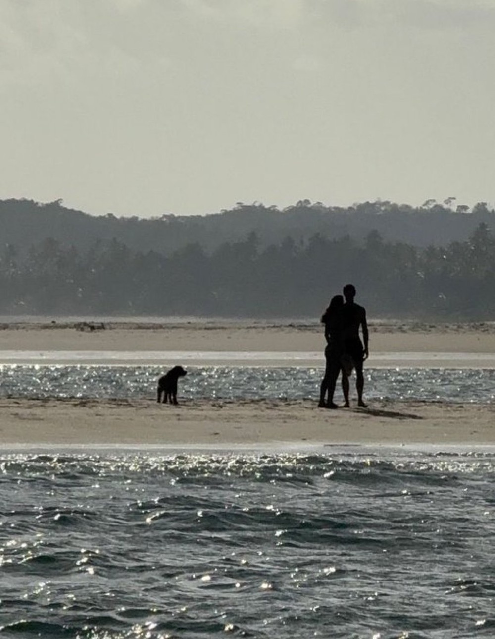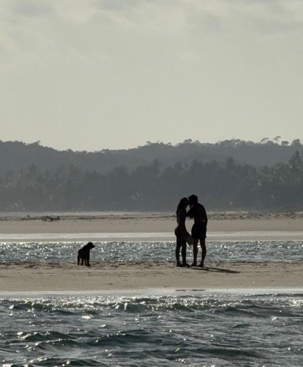 Além do momento no mar, o casal também foi visto caminhando pela praia sob a luz do sol ao lado de Chihiro, cachorro adotado por Bruna Marquezine durante uma viagem ao Japão, na época em que namorava o ator João Guilherme.