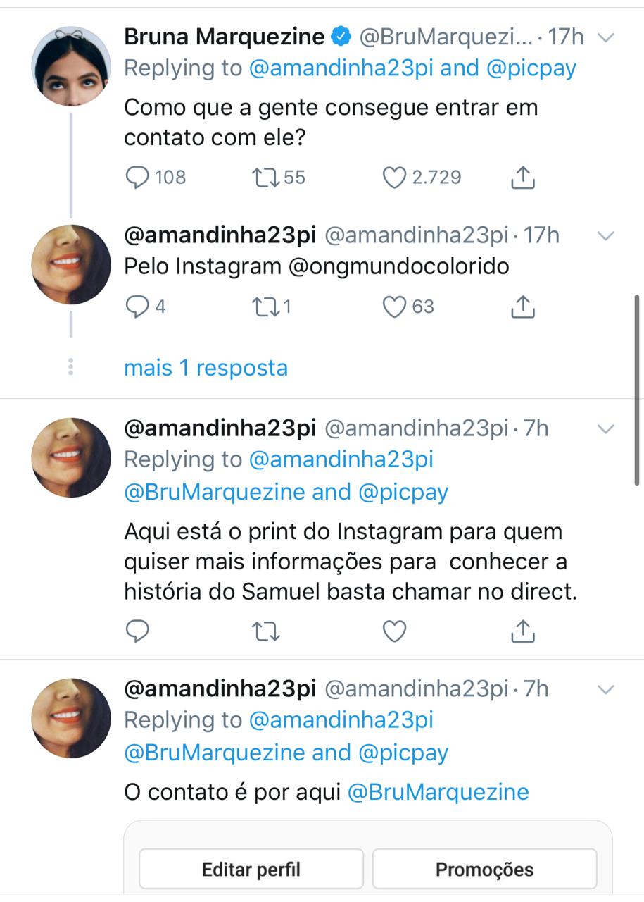 Bruna Marquezine prontamente respondeu ao pedido. "Como que a gente consegue entrar em contato com ele?", perguntou. "Irei enviar as fotos da casa do Samuel aqui pra que vocês possam ver a situação deles. Aqui está o print do Instagram para quem quiser mais informações para conhecer a história do Samuel, basta chamar no direct", falou Amanda recomendando que a atriz procurasse o perfil da Ong Mundo Colorido no Instagram.