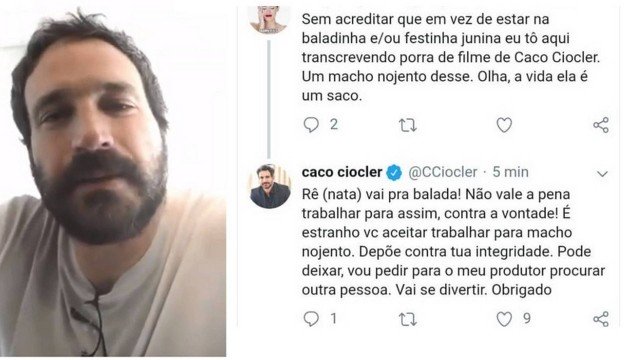 Caco Ciocler usou o Twitter na tarde deste sábado para explicar a polêmica envolvendo o seu nome com de uma internauta que o chamou de "macho nojento" no Twitter. Um perfil com nome de Renata publicou um post lamentando estar em casa em plena noite de sexta-feira transcrevendo um filme do ator em vez de estar numa "baladinha" ou "festinha junina". Ao tomar conhecimento do post, Caco respondeu no próprio Twitter, aconselhando a jovem a ir para balada e disse que iria pedir ao seu produtor para procurar outra pessoa para o trabalho. As informações são do Extra.