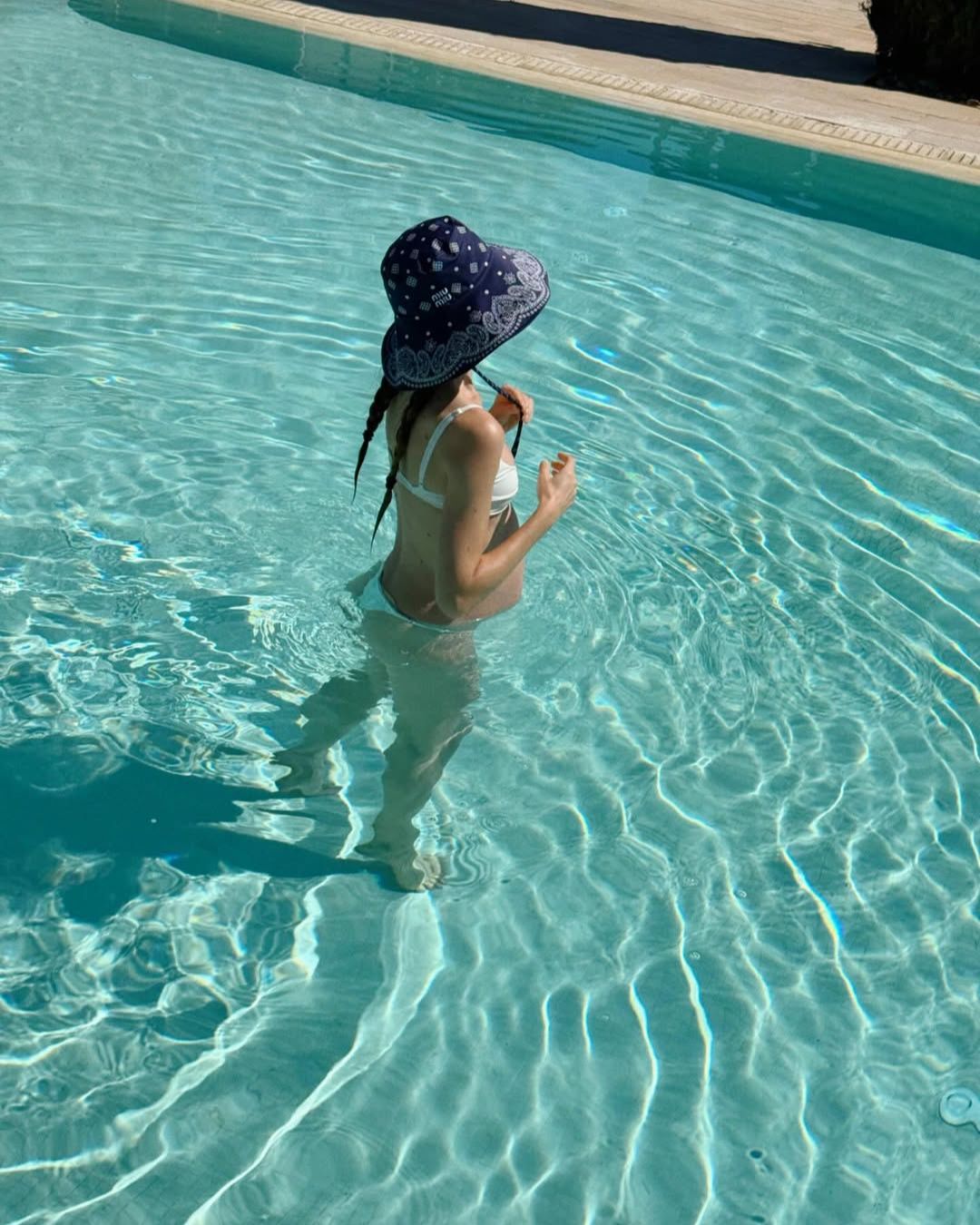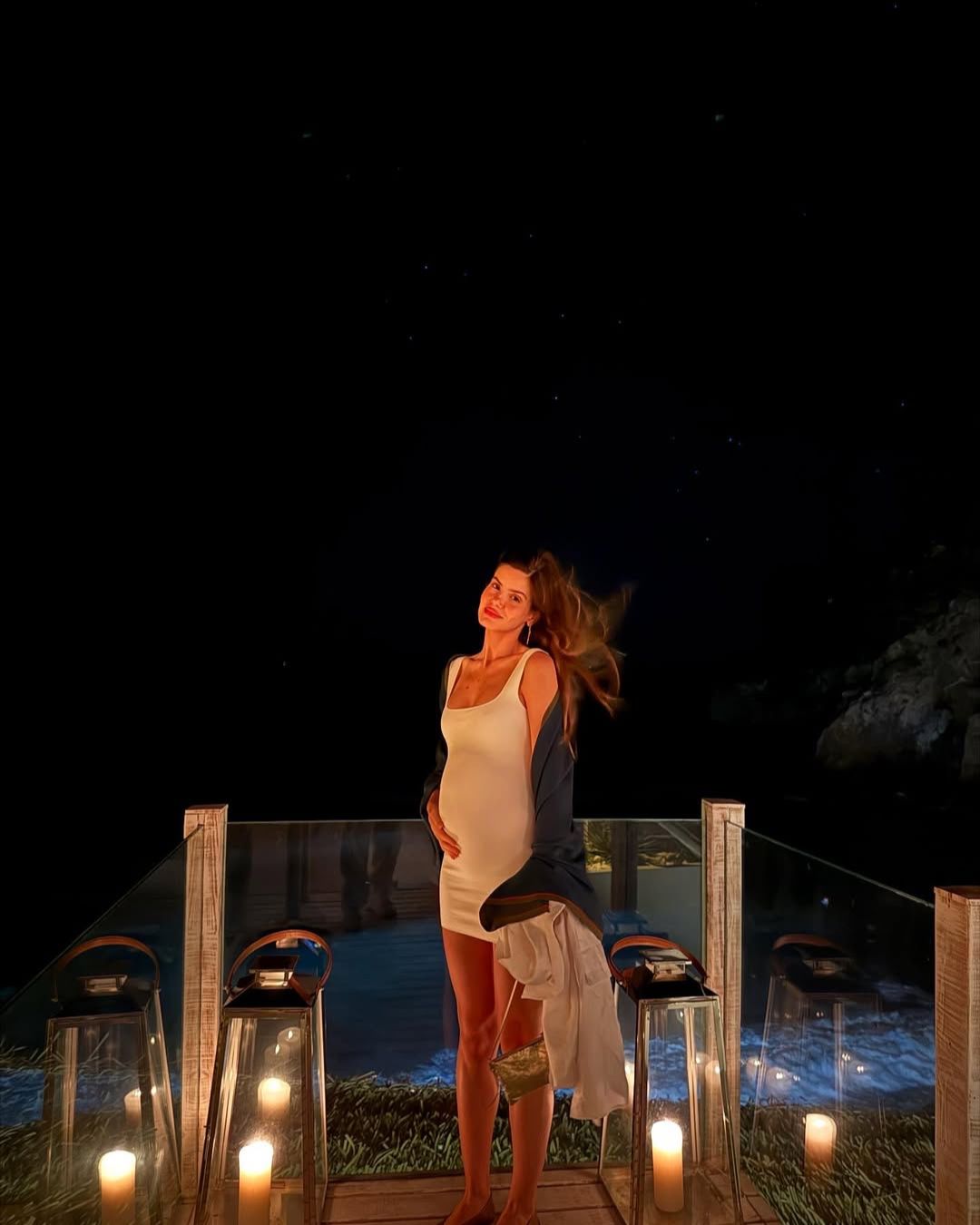 Ela mostrou imagens do local com mar transparente e também exibiu a barriga da gestação.