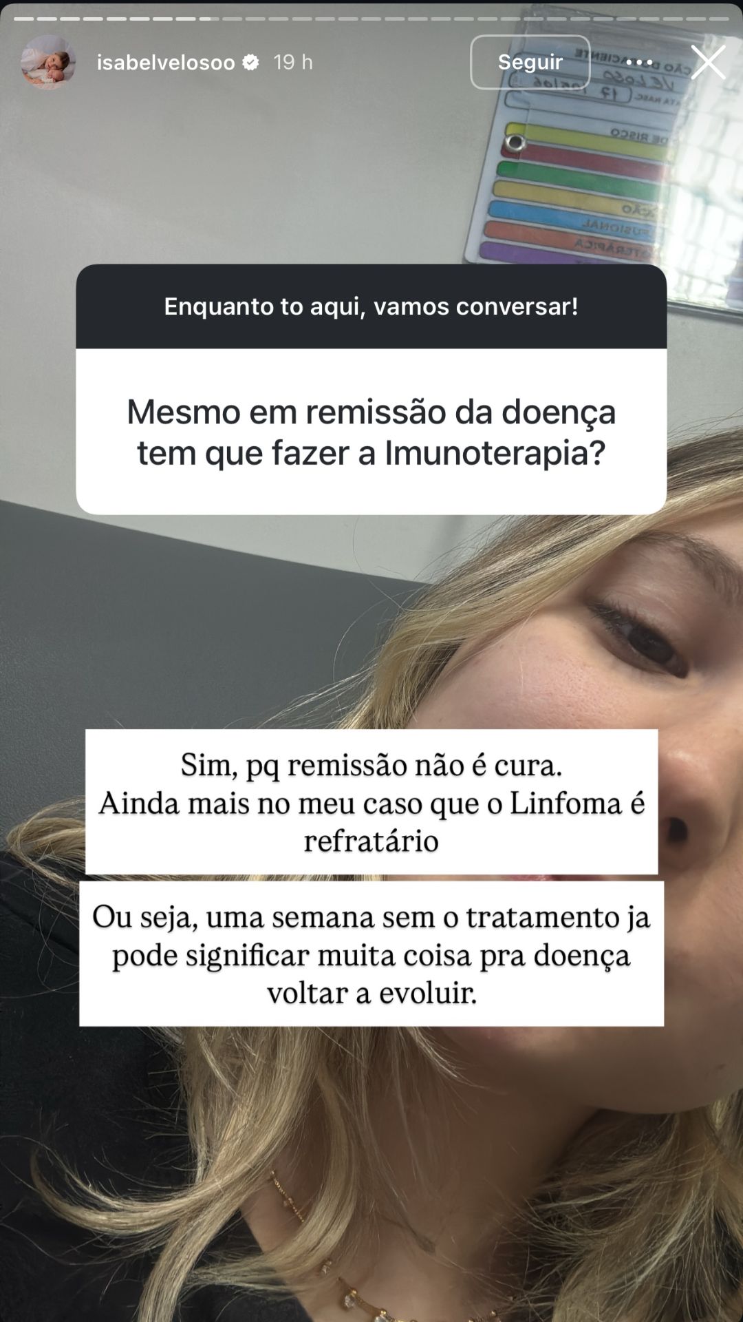Mesmo com o câncer em remissão atualmente, ela continua realizando sessões de imunoterapia. "Remissão não é cura. Ainda mais no meu caso que o Linfoma é refratário. Ou seja, uma semana sem o tratamento já pode significar muita coisa pra doença voltar e evoluir", afirmou. "Remissão é só um sinal que a doença parou de evoluir por uma causa: tratamento."