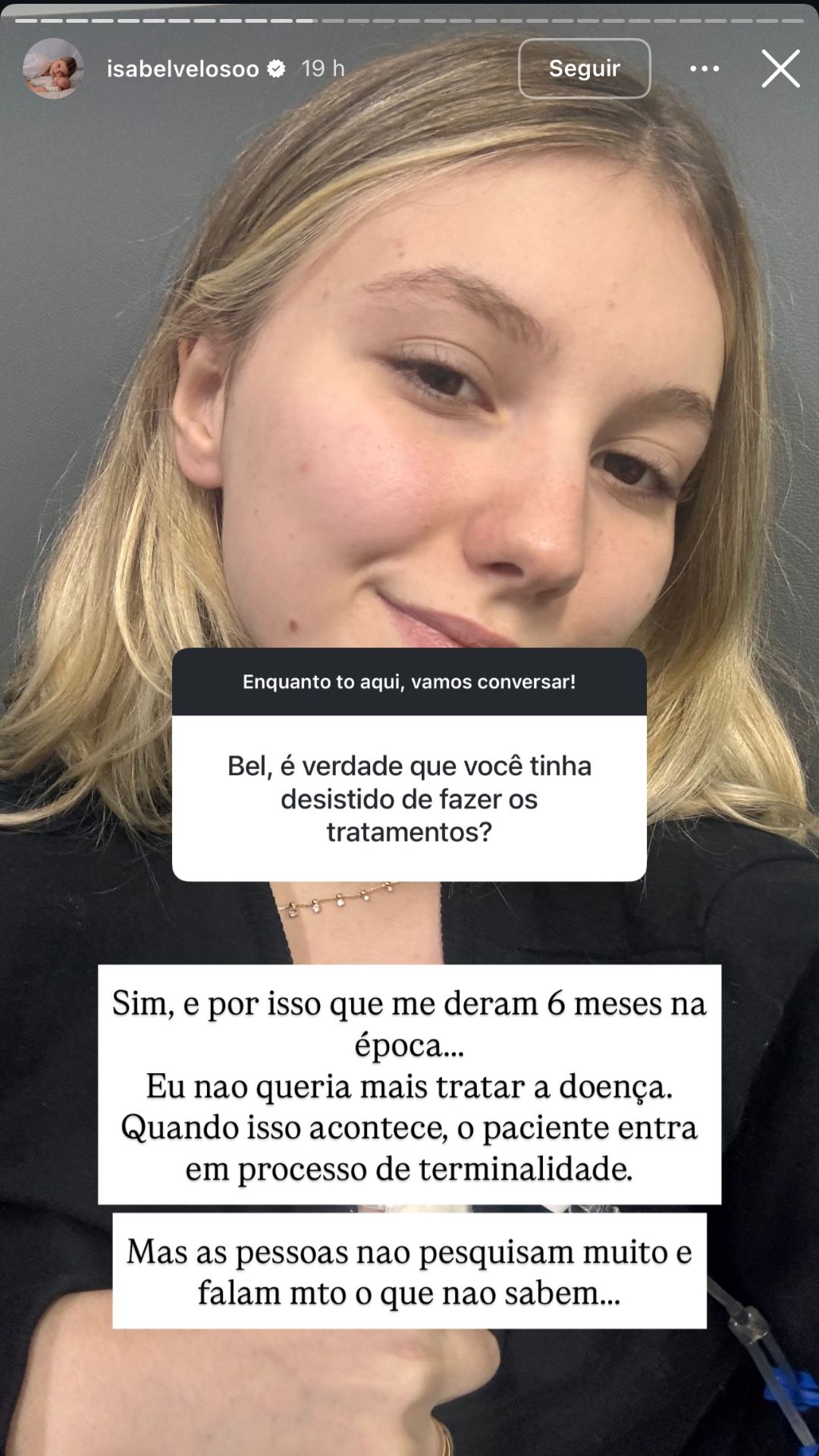 A outra pergunta foi: "Bel, é verdade que você tinha desistido de fazer os tratamentos?". Isabel respondeu: "Sim, é por isso que me deram 6 meses na época... eu não queria mais tratar a doença. Quando isso acontece, o paciente entra em processo de terminalidade. Mas as pessoas não pesquisam muito e falam muito o que não sabem".