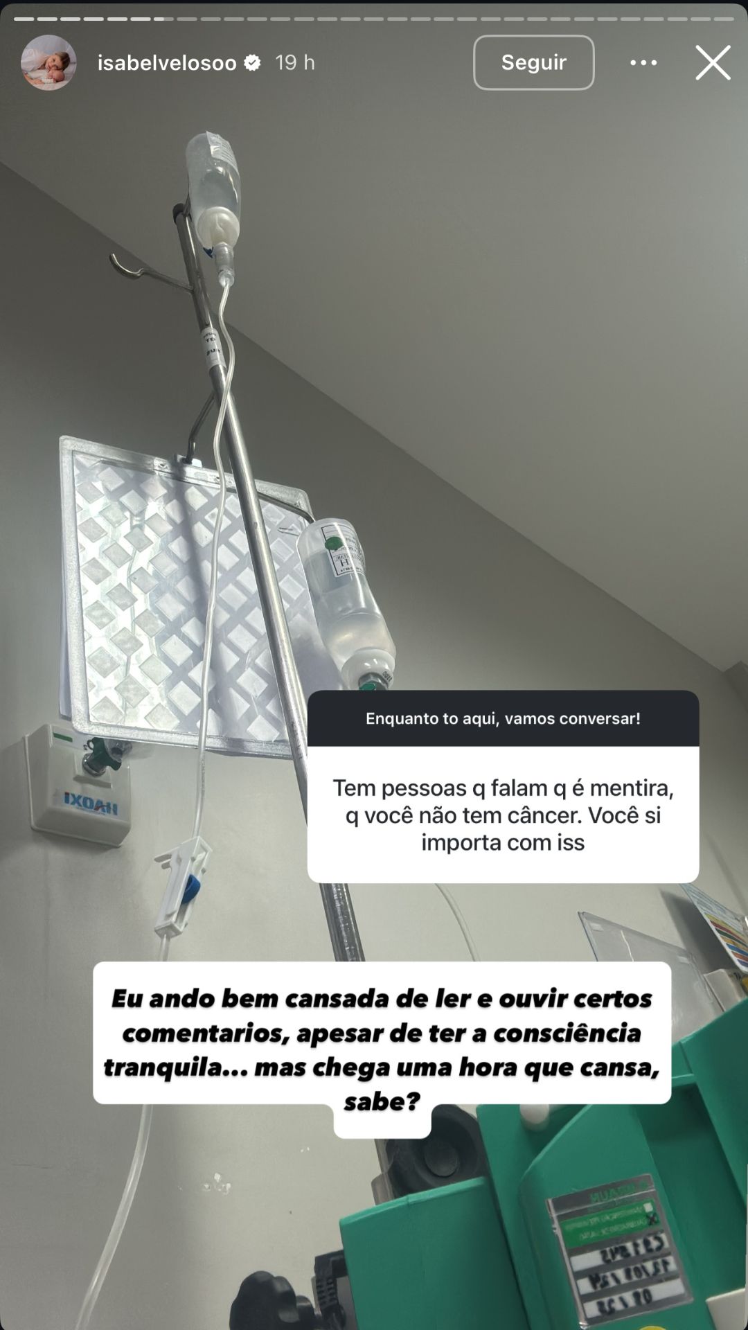Durante uma interação com o público pelo Instagram, Isabel foi questionada: "Tem pessoas que falam que é mentira, que você não tem câncer. Você se importa com isso". Em resposta, e em tom de desabafo, disse: "Eu ando bem cansada de ler e ouvir certos comentários, apesar de ter a consciência tranquila... mas chega uma hora que cansa, sabe?".