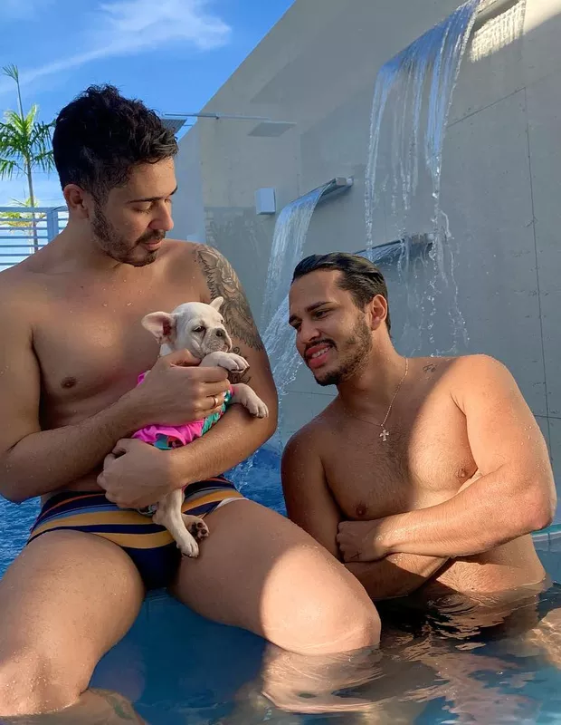Carlinhos Maia se divertiu na piscina com o noivo Lucas Guimarães. Na rede social, ele apresentou a nova cachorrinha do casal, Valentina Prada: "Já tá de biquíni e tudo. Bem vinda a sua casa, é sua família", festejou o influenciador.