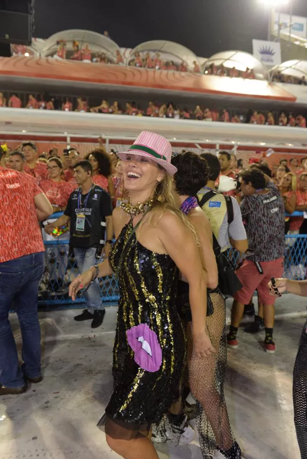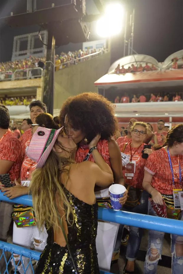 Carolina Dieckmann desfilou pela Mangueira na madrugada deste domingo (10) no Desfile das Campeãs e surpreendeu Tais Araújo com um selinho, quando a atriz passava pelo Camarote QUEM O Globo.