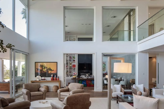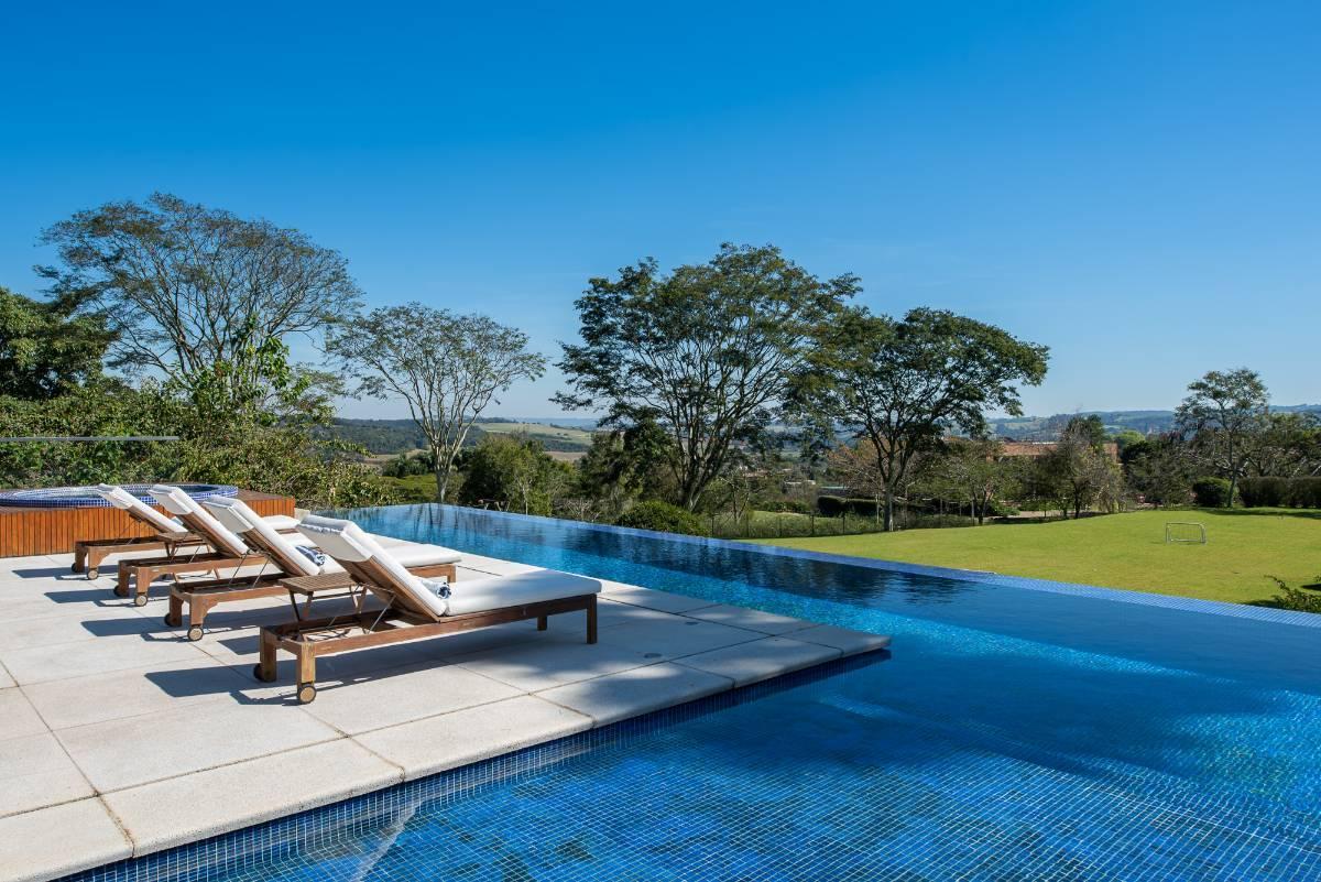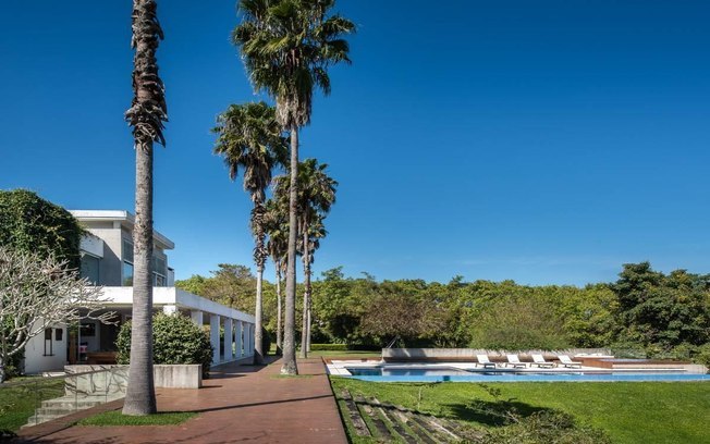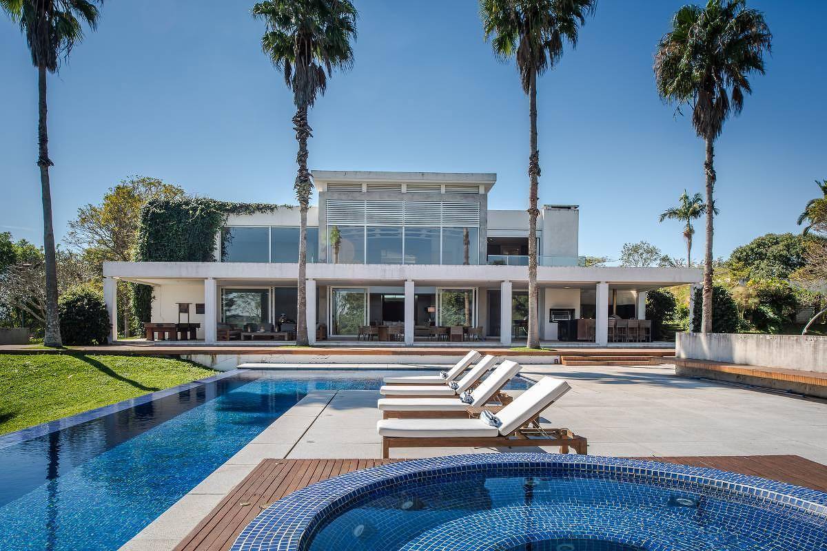 O anúncio do site Imovelweb diz o seguinte: Hall de entrada com pé direito duplo, sala de estar com 2 ambientes, sala de jantar, home theather, lavabo, sala íntima com TV. São 8 suítes, sendo a suíte principal com closet e 2 banheiros (Sr. e Sra.), rouparia, cozinha gourmet, ampla varanda com 4 ambientes mais churrasqueira e forno de pizza, piscina, jacuzzi, sauna úmida, salão de jogos, quadra de tênis, mini campo de futebol gramado, playground, residência para caseiros, suíte para babás, mini horta, canil.