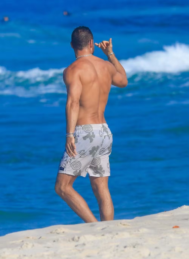 Para curtir melhor o dia, o galã escolheu um visual mais despojado, exibindo o corpão: apenas uma bermuda estampada.