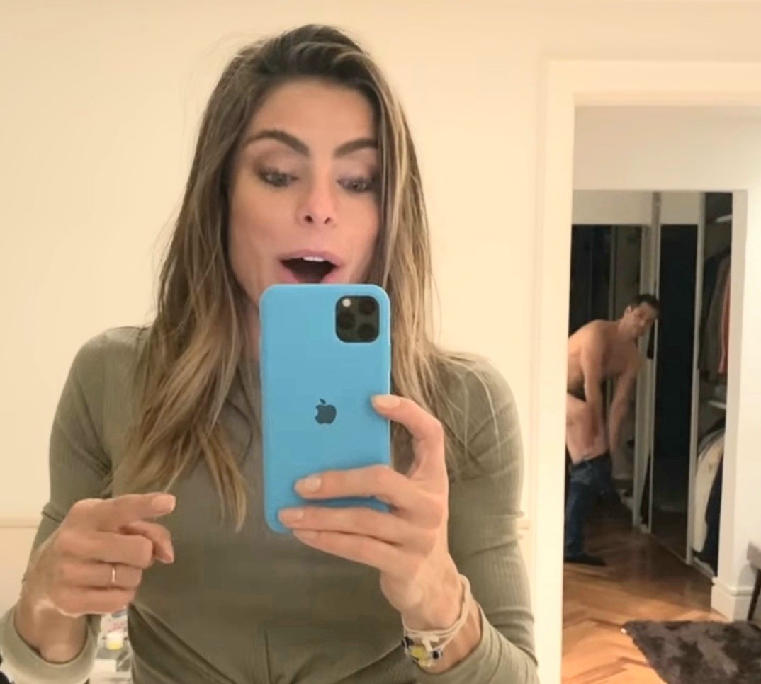 Posicionada em frente a um espelho, de onde era possível ver um corredor pelo reflexo, Dani acabou exibindo um momento de intimidade do marido, o empresário Guilherme Menge.
