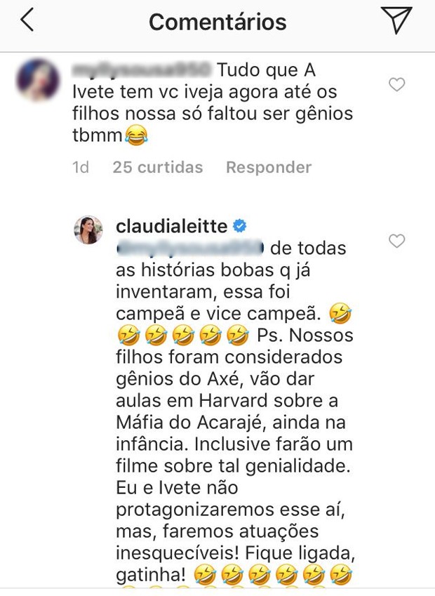 "Tudo o que a Ivete tem você tem inveja. Agora até os filhos. Só faltou ser gêmeos também", disse a internauta. Claudia fez questão de responder com o maior bom humor: "De todas as histórias bobas que inventaram essa foi campeã e vice campeã. Nossos filhos foram considerados gênios do Axé, vão dar aulas em Harvard sobre a Máfia do Acarajé, ainda na infância. Inclusive farão um filme sobre tal genialidade. Eu e Ivete não protagonizaremos esse aí, mas faremos atuações inesquecíveis. Fique ligada, gatinha!".