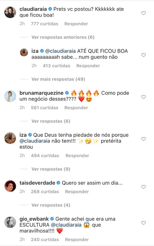 Amigas famosas da atriz também deixaram seus comentários, enchendo Claudia de elogios. Bruna Marquezine, Taís Araújo, Giovanna Ewbank, Paolla Oliveira, Deborah Secco, Isis Valverde e Cris Vianna foram apenas algumas que babaram pelo clique.