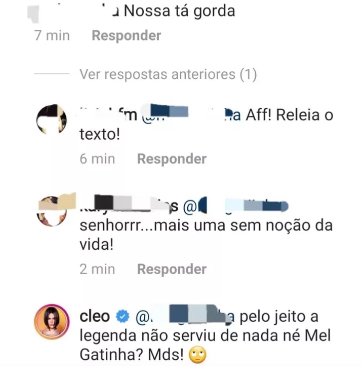 Mesmo com a mensagem de empoderamento que o texto compartilhado por Cleo trazia, algumas seguidoras questionaram porque ela tinha mudado tanto a aparência e uma até a chamou de gorda. "Pelo jeito a legenda não serviu de nada né? Meu Deus!", reclamou a atriz.