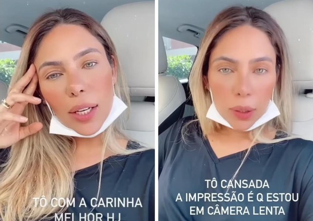 Em seus Stories, Karina, dona do perfil Dicas da Ka, surgiu dentro do carro com a máscara de proteção facial no queixo contando dos planos deles para aquele momento: "Vamos andar um pouquinho pra distrair a mente".