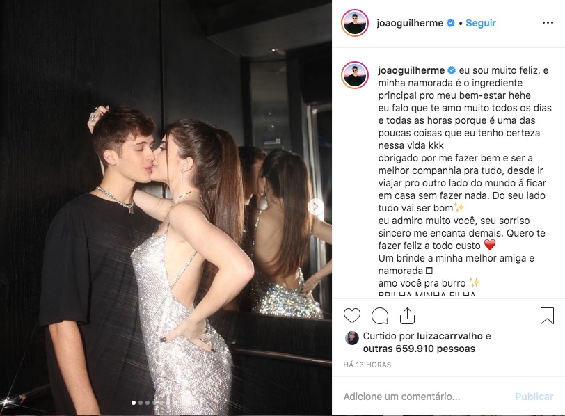"Eu sou muito feliz, e minha namorada é o ingrediente principal pro meu bem-estar. Eu falo que te amo muito todos os dias e todas as horas porque é uma das poucas coisas que eu tenho certeza nessa vida. Obrigado por me fazer bem e ser a melhor companhia pra tudo, desde ir viajar pro outro lado do mundo á ficar em casa sem fazer nada. Do seu lado tudo vai ser boa", escreveu o ator em uma legenda no Instagram.