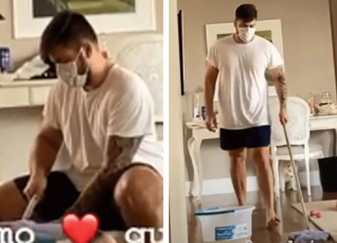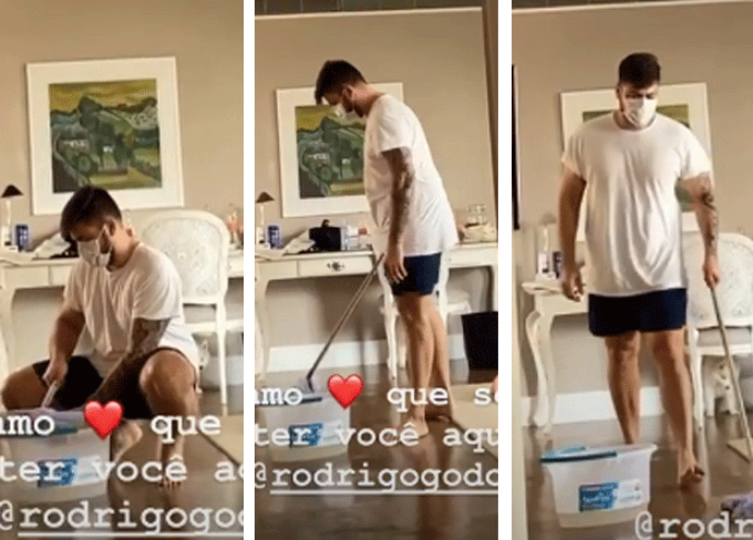 "Enquanto eu estou aqui vendo as notícias a faxina está rolando. Mozi, ei, te amo", derreteu-se ela, que tinha a televisão ligada em um notíciário sobre a pandemia, vendo a entrevista do chefe de operações de emergências da Organização Mundial de Saúde. "Também te amo, por isso estou limpando isso aqui tudo para você", brincou Rodrigo. "Quando a gente casou, o padre falou na alegria e na tristeza, na saúde e na doença", lembrou Preta, que mostrou também Soraya Rocha (maquiadora) ajudando na limpeza.
