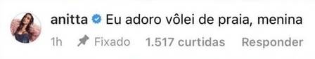 Em Tóquio para disputar os jogos olímpicos, o jogador de vôlei de praia (e galã) Vinicius Freitas chamou atenção de Anitta numa postagem. Ao ver a foto do atleta, a cantora comentou: "Eu adoro vôlei de praia, menina".