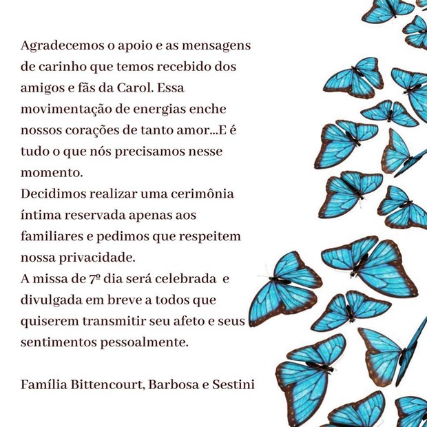 "Agradecemos o apoio e mensagens de carinho que temos recebido de amigos e fãs de Carol. Essa movimentação de energia enche nossos corações de tanto amor. É tudo que precisamos neste momento. Decidimos realizar uma cerimônia íntima reservada apenas a familiares e pedimos que respeitem nossa privacidade.