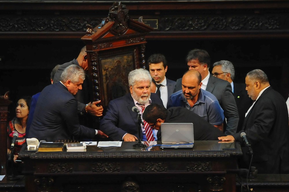 O deputado Wagner Montes é carregado para a cadeira da presidência da Alerj. Ele presidiu a sessão que livrou os deputados Jorge Picciani, Edson Albertassi e Paulo Melo da prisão determinada pela Justiça na operação Cadeira Velha — Foto: Luiz Ackermann/Agência O Dia/Estadão Conteúdo