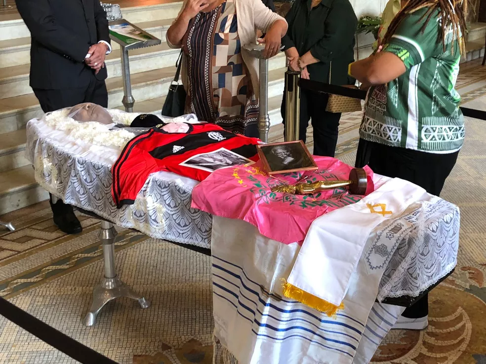 Camisa do Flamengo e bandeira da Mangueira sobre caixão de Milton Gonçalves — Foto: Henrique Coelho/g1