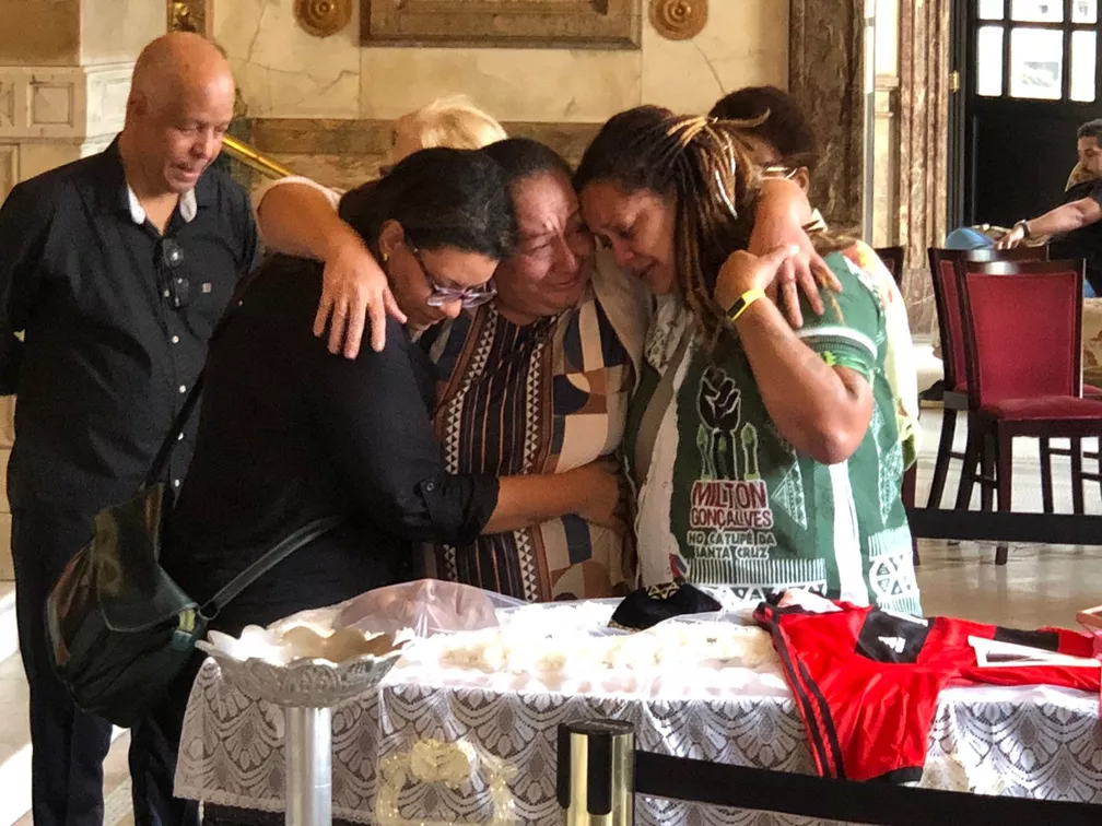 Filhas de Milton Gonçalves (E e D) choram diante do corpo do pai, ao lado de uma prima — Foto: Henrique Coelho/g1