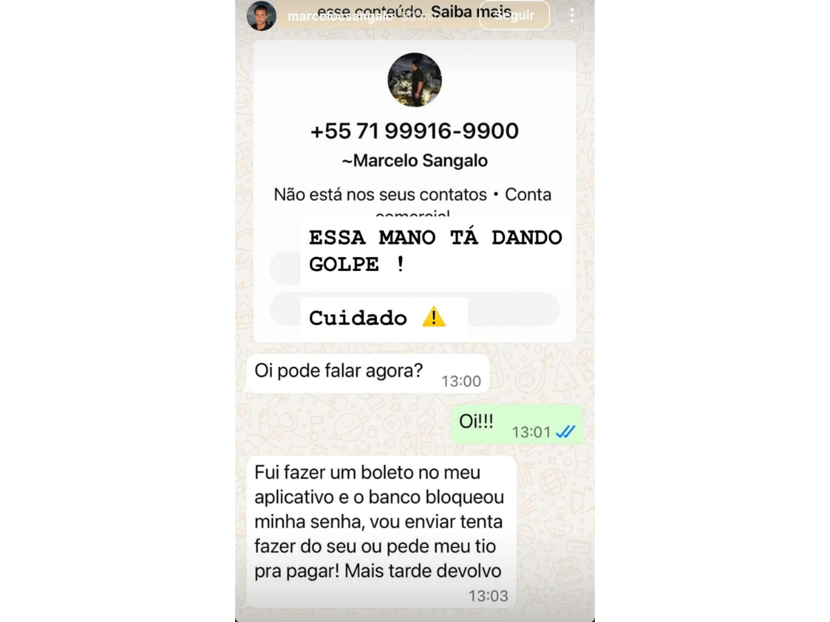 Marcelo Sangalo, filho de Ivete, usou o Instagram para alertar seus seguidores. Segundo ele, um homem tentou se passar por ele para pedir dinheiro, nesta sexta-feira (05). Marcelo compartilhou o print da conversa com um contato que utilizava seu nome e sua foto. O hereiro denunciou: “Esse mano tá dando golpe! Cuidado”!