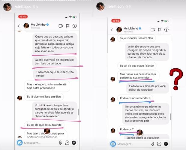 Nos prints, é possível ver que Livinho pede desculpas, mas também diz que Raielli está querendo aparecer e que ela não precisa disso, pois tem brilho e talento. A dançarina responde, falando que o funkeiro comprou a advogada dela, a ameaçou e ela perdeu muitos trabalhos, além de que ele não se importa de verdade.