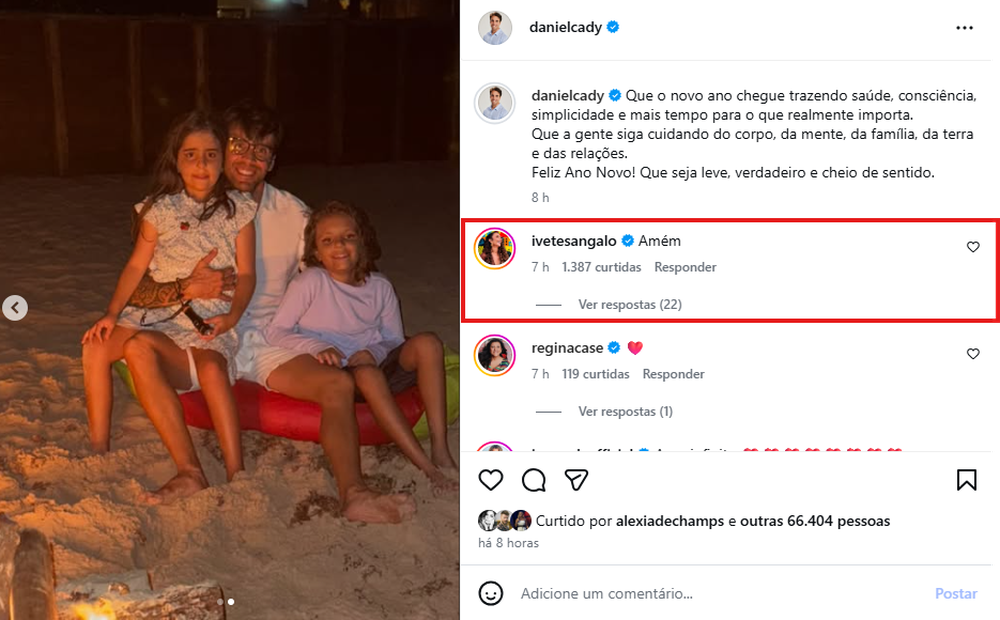Na legenda da publicação, Daniel fez uma reflexão sobre o novo ano. “Que o novo ano chegue trazendo saúde, consciência, simplicidade e mais tempo para o que realmente importa. Que a gente siga cuidando do corpo, da mente, da família, da terra e das relações. Feliz Ano Novo! Que seja leve, verdadeiro e cheio de sentido”, escreveu. Ivete comentou no post do ex-marido com a mensagem: “Amém”.