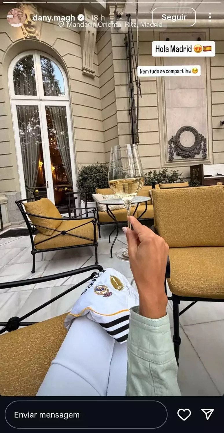 Em uma das publicações, Day escreveu: “Hola, Madrid. Nem tudo se compartilha”, posando com uma taça de champanhe e a camisa do time de Vini Jr. Ela também destacou cuidados com sua segurança ao postar: “Postando um pouco do jogo. Não publico no momento em que acontece por questão de segurança”, explicou.
