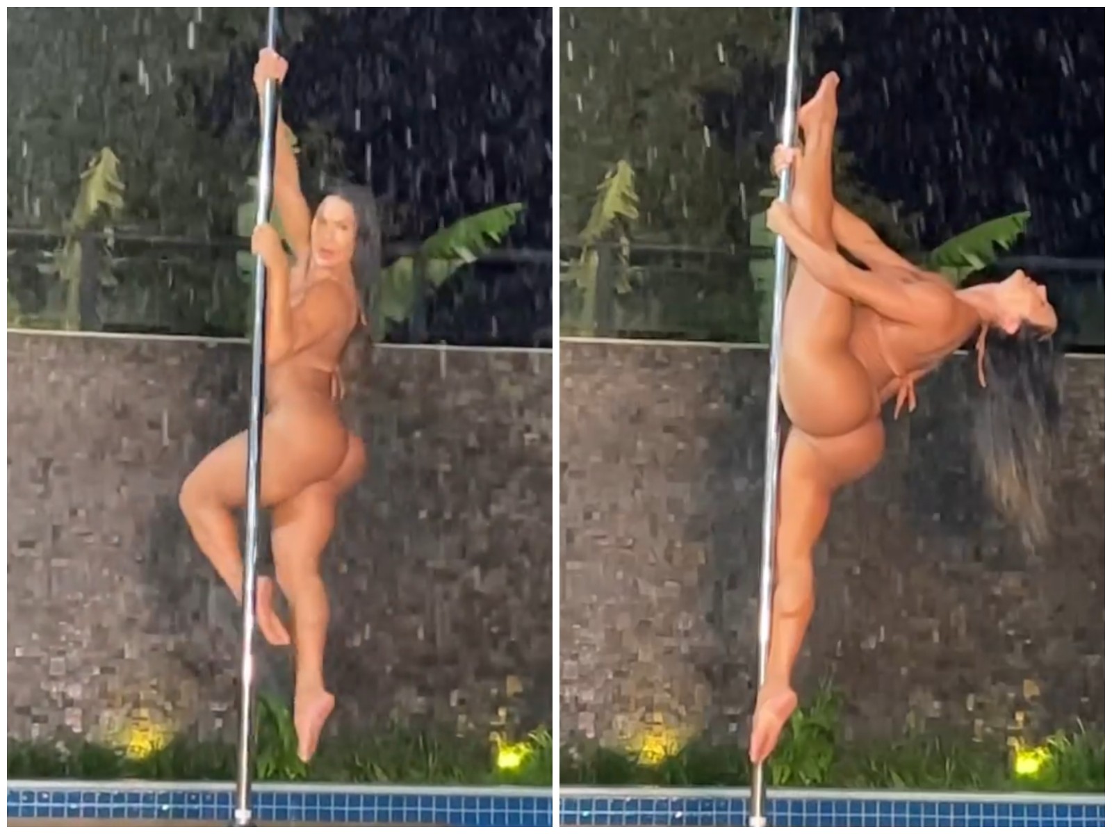 De biquíni, Gracyanne surpreende com exibição de pole dance na chuva |