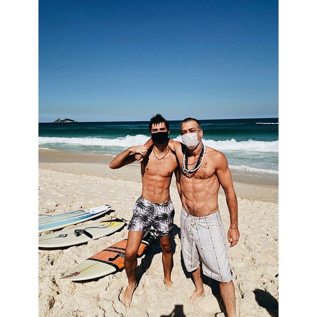 Fábio Assunção curtiu o domingo (26) de sol ao lado do filho mais velho, João Assunção, de 17 anos. O rapaz compartilhou duas fotos com o ator de 48 anos no Instagram em imagens em que os dois estão na areia, abraçados, usando máscaras de proteção facial recomendadas durante a pandemia de coronavírus. As imagens também ressaltam a boa forma do ator, que nos últimos dez meses perdeu 27 quilos com exercícios físicos e reeducação alimentar.
