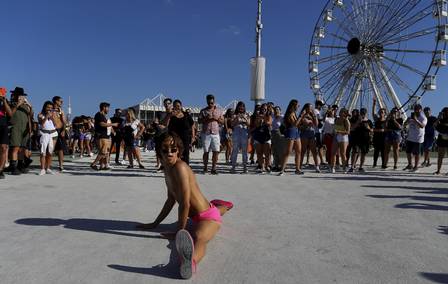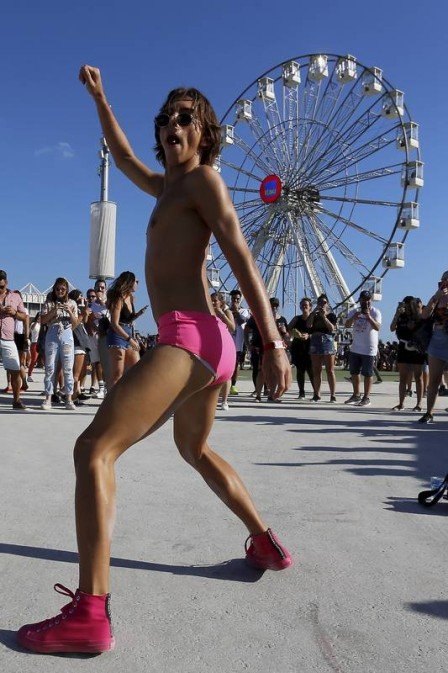 Em um dia repleto de cores no Rock in Rio, um estudante da Bahia tem chamado a atenção no meio do público da Cidade do Rock. Com um figurino ousado, o jovem Murilo Genasha, de 17 anos, optou por vestir apenas uma sunguinha rosa em tom neón - que combina com o par de tênis. Segundo ele, uma homenagem para as duas maiores divas pop: Pink e Anitta. Performático, ele chamou a atenção desde a abertura dos portões, fazendo espacates e outros passos de dança. As informações são do Extra.