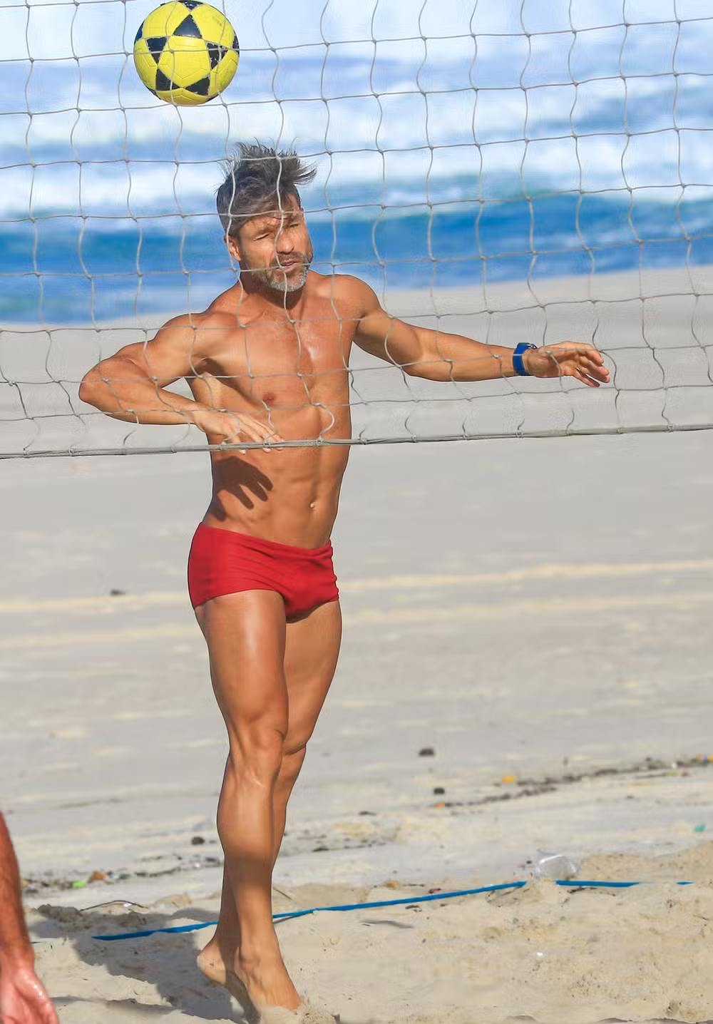 O ex-jogador de futebol, que atualmente integra o time de comentaristas do Grupo Globo, estava usando uma sunga vermelha e deixou em evidência seu corpão sarado.