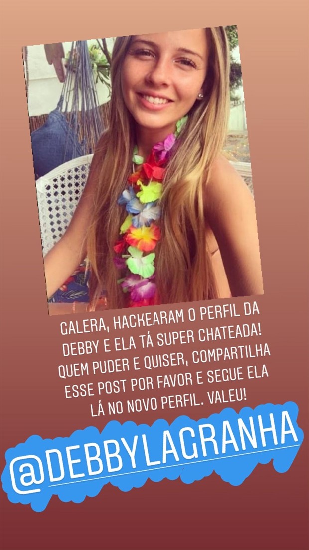 "Galera, hackearam o perfil da Debby e ela está super chateada! Quem puder e quiser, compartilha este post por favor e segue ela lá no novo perfil. Valeu!", disse.