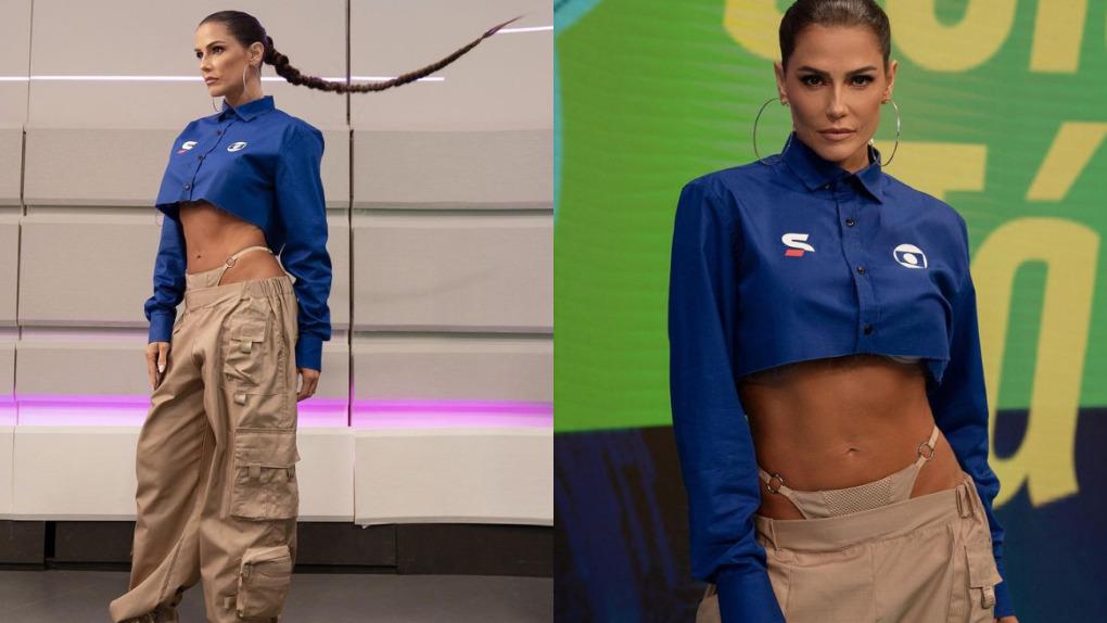 A atriz Deborah Secco estreou nesse domingo (20), como comentarista da Copa do Mundo no programa “Tá Na Copa”, do SportTV. No entanto, nas redes sociais, o que chamou atenção foi o look escolhido pela atriz: ela transformou o uniforme do canal em cropped e deixou a calcinha a mostra. Deborah completou o look com uma calça cargo e um scarpin.