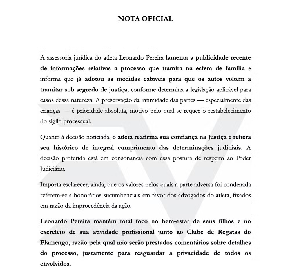 Por fim, a equipe jurídica do jogador reforçou o pedido de respeito à privacidade das partes envolvidas, sobretudo das crianças.
