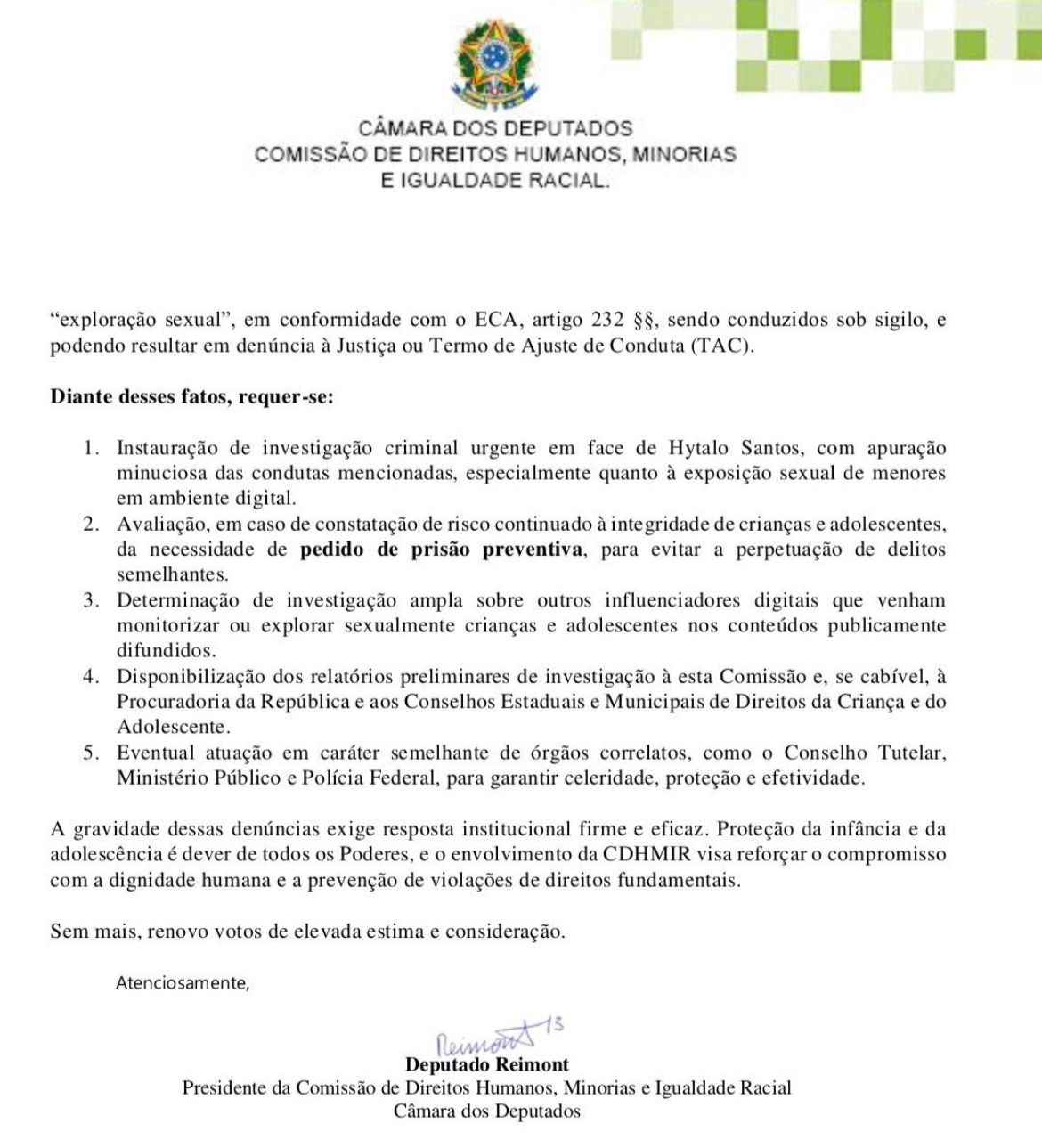 A denúncia ganhou destaque após o influenciador Felca alertar sobre a “adultização” e possível exploração de crianças e adolescentes nos vídeos publicados por Hytalo. No documento oficial, Reimont solicita a abertura urgente de investigação para apurar as condutas do influenciador, com destaque para uma possível exploração de imagens de menores.