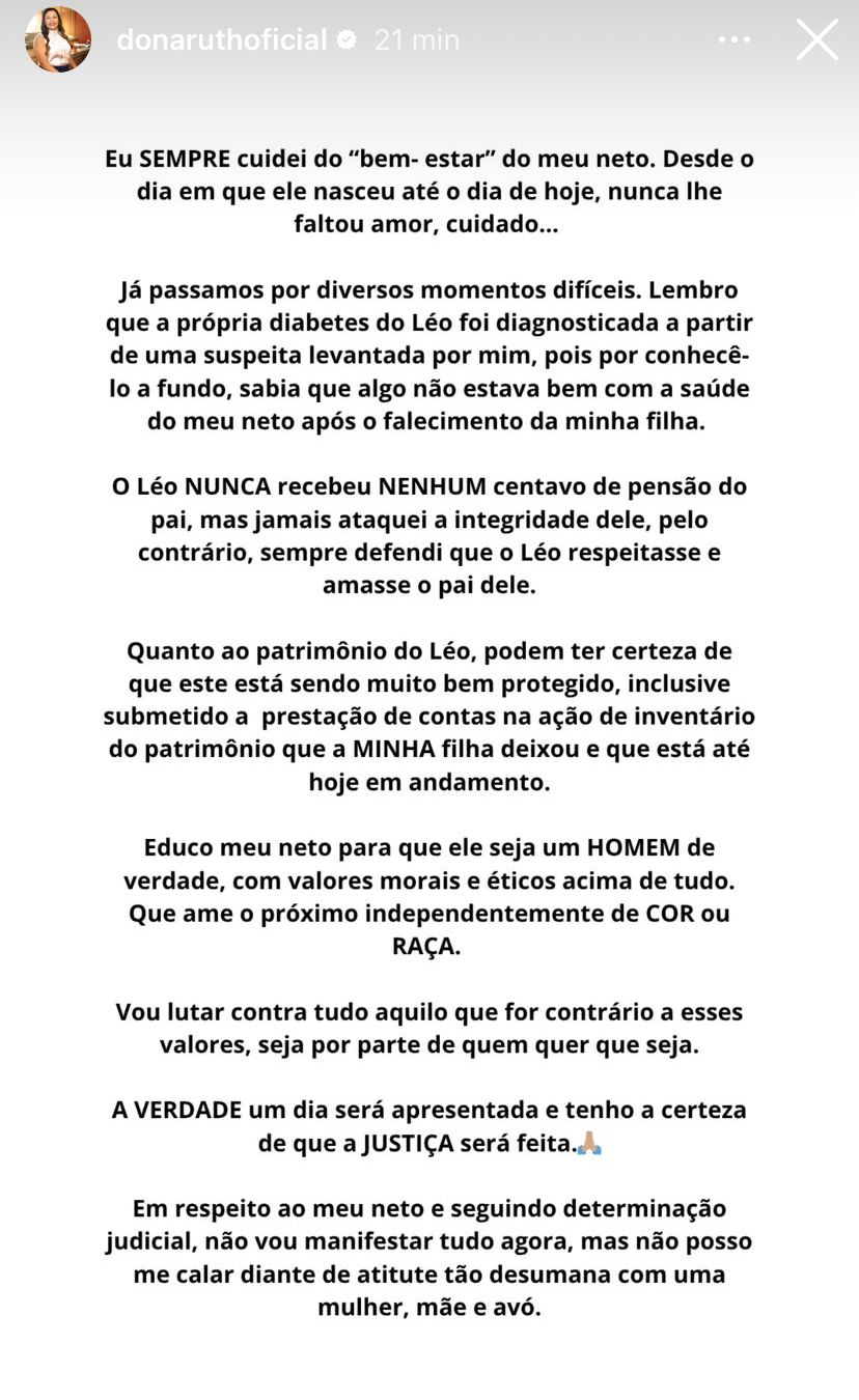 Dona Ruth prosseguiu dizendo que o ex-genro nunca pagou pensão ao filho e isso nunca se tornou motivo de ataque. "O Léo NUNCA recebeu NENHUM centavo de pensão do pai, mas jamais ataquei a integridade dele, pelo contrário, sempre defendi que o Léo respeitasse e amasse o pai dele", continuou.