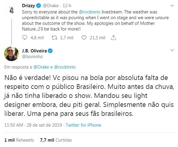 No entanto, o diretor Boninho não concordou com a explicação de Drake e deu uma visão diferente dos bastidores nas respostas da publicação do rapper.
