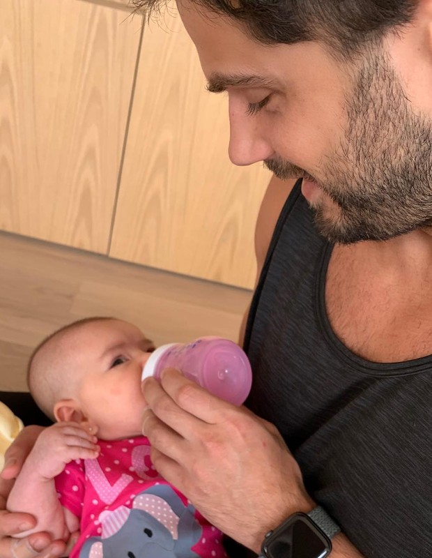 Duda Nagle mostrou seu lado paizão ao compartilhar no Instagram uma foto em que aparece dando mamadeira para a pequena Zoe. A menina, de apenas 1 mês, é fruto do seu relacionamento com Sabrina Sato. "Papai dando o leitinho da mamãe", disse ele.