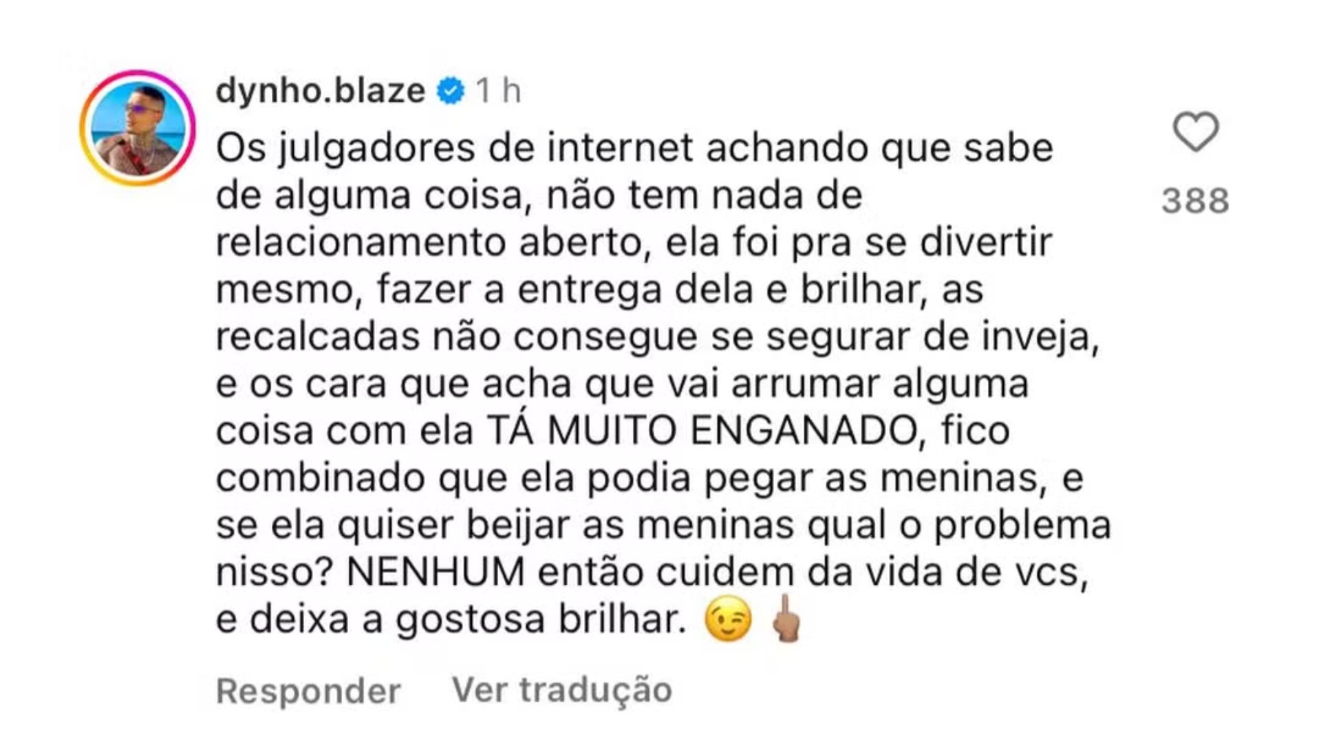 Os julgadores de internet achando que sabem de alguma coisa. Não tem nada de relacionamento aberto. Ela foi pra se divertir mesmo, fazer a entrega dela e brilhar. As recalcadas não conseguem se segurar de inveja, e os cara que acham que vão arrumar alguma coisa com ela estão muito enganados. Ficou combinado que ela podia pegar as meninas, e se ela quiser beijar as meninas, qual o problema nisso? Nenhum. Então cuidem da vida de vocês e deixem a gostosa brilhar.