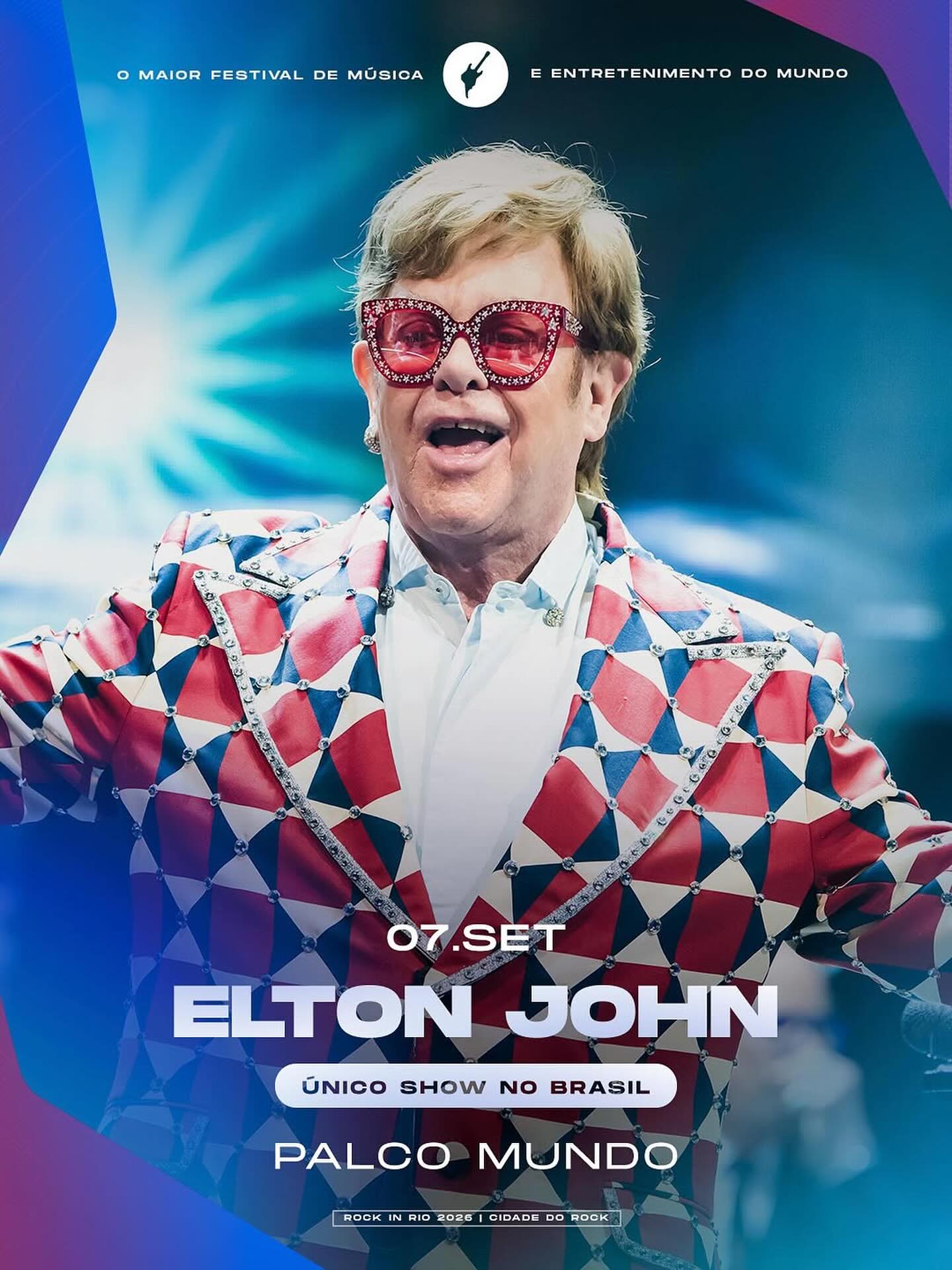O cantor e compositor britânico Elton John foi confirmado no Rock in Rio 2026 nesta terça-feira (25). Segundo anúncio do festival, o artista será o headliner do dia 7 de setembro, quando sobe ao palco Mundo para sua única apresentação no Brasil durante a passagem pelo país.