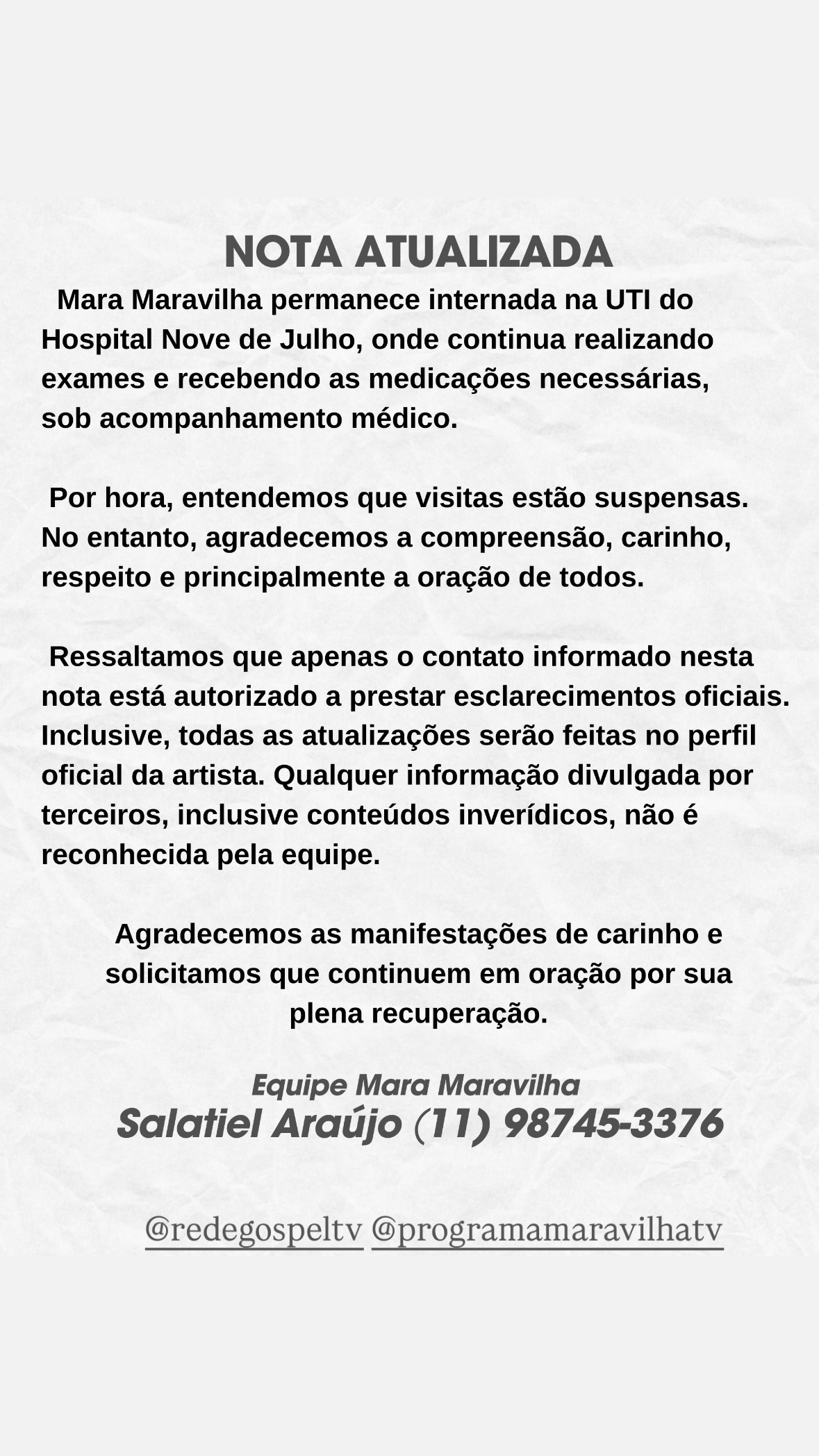 A equipe da apresentadora Mara Maravilha divulgou uma nova atualização sobre o estado de saúde da artista que precisou de atendimento médico de emergência e está internada na Unidade de Terapia Intensiva (UTI) do Hospital Nove de Julho, em São Paulo.
