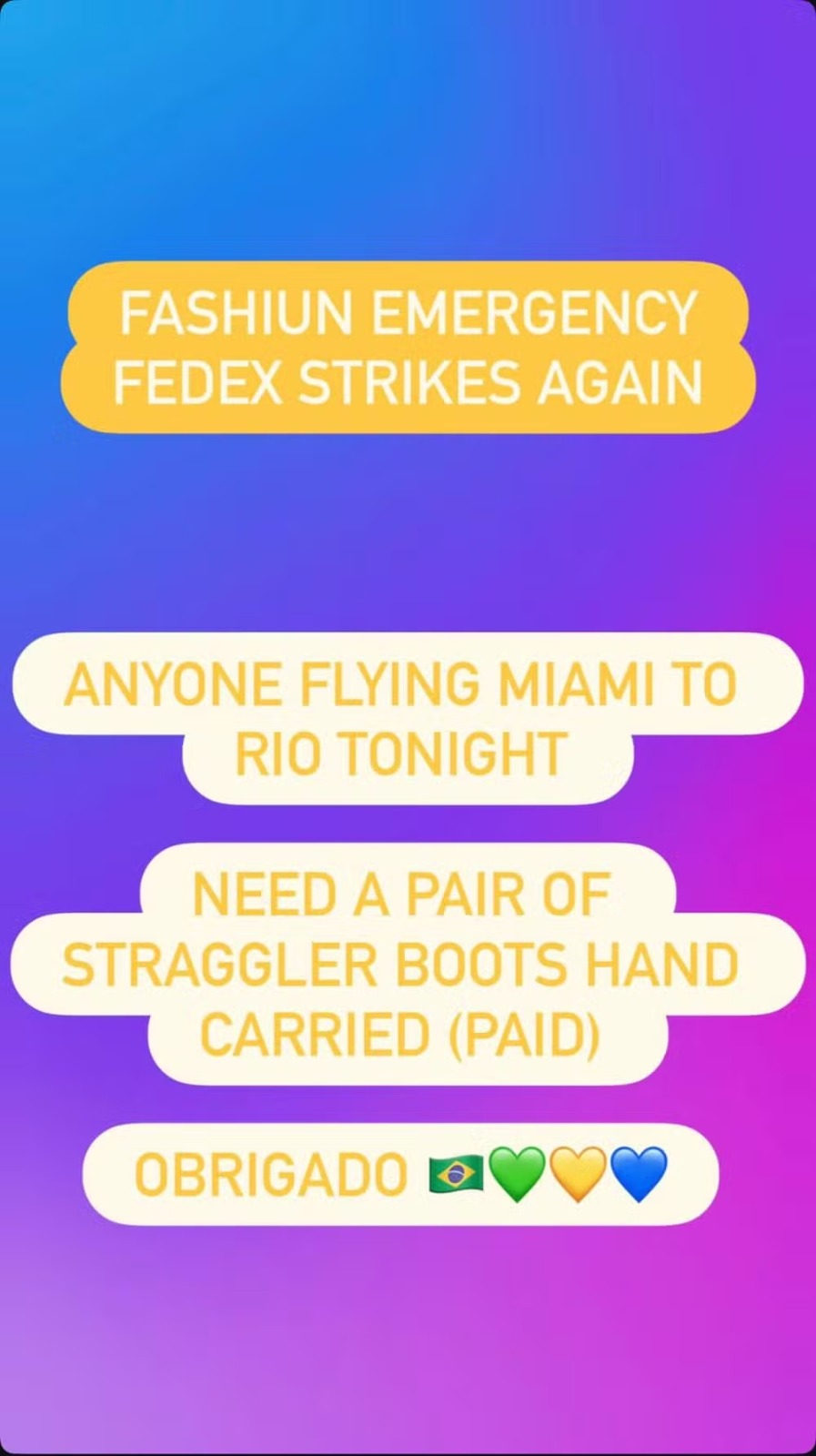 Em publicação nos Stories do Instagram, o estilista relatou dificuldades com o envio do material e fez um apelo aos seguidores. “Emergência fashion! A FedEx ataca novamente. Alguém voando de Miami para o Rio hoje à noite? Preciso que levem um par de botas Straggler na bagagem de mão, pago. Obrigado”, escreveu.