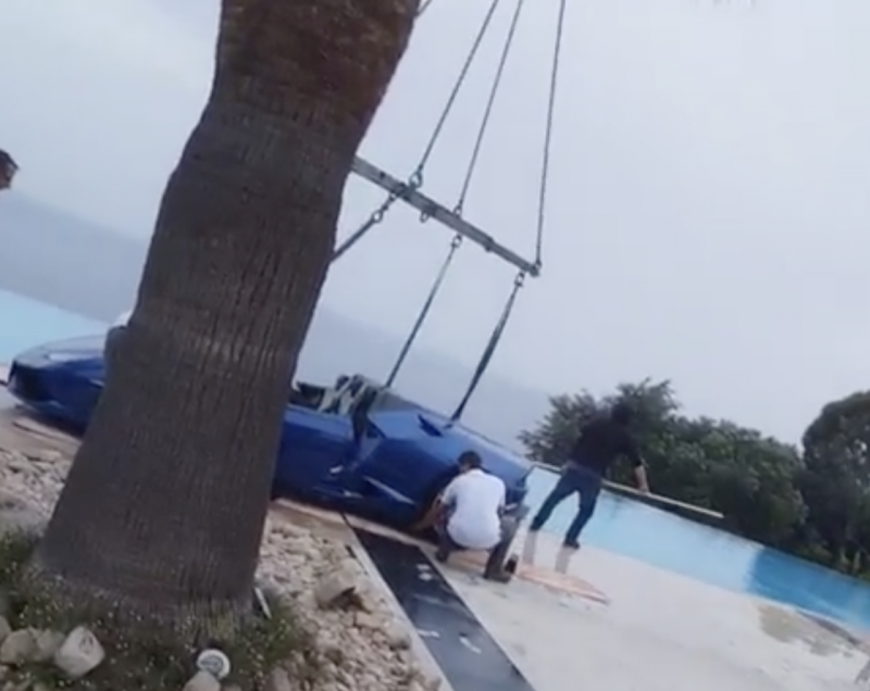 Usando sapatos de salto alto, ela tentou estacionar a Lamborghini próxima a uma piscina. No entanto, seu pé acabou escapando do pedal de freio, o que jogou o carro na piscina.