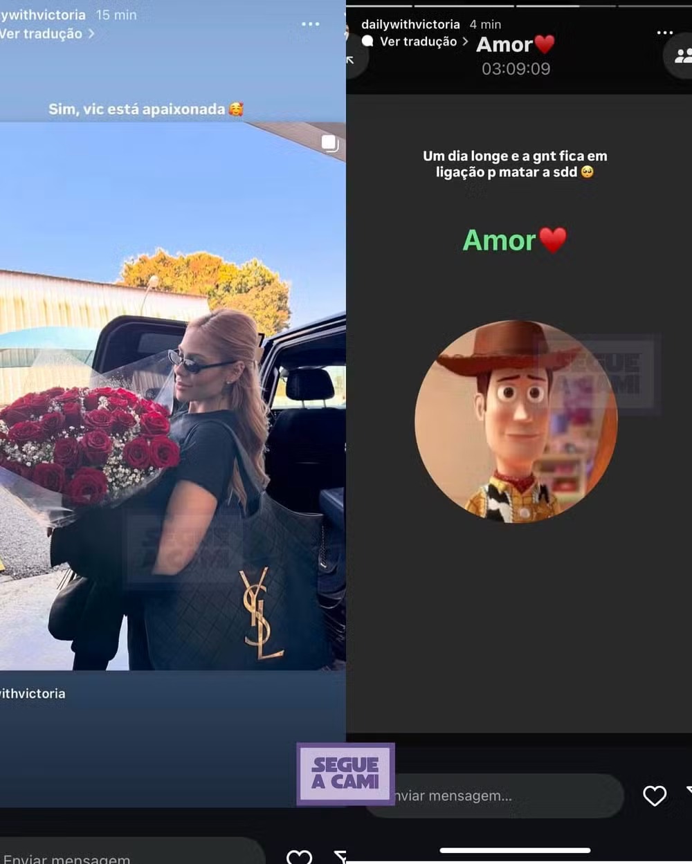 Nos registros, Victoria aparece com um buquê de rosas e deixou no ar que está vivendo um novo relacionamento. “Sim, Vic está apaixonada”, escreveu em um dos posts. Em outra publicação, a influenciadora revelou ter passado mais de três horas em ligação com Luan. "Um dia longe e a gente fica em ligação para matar a saudade", escreveu.