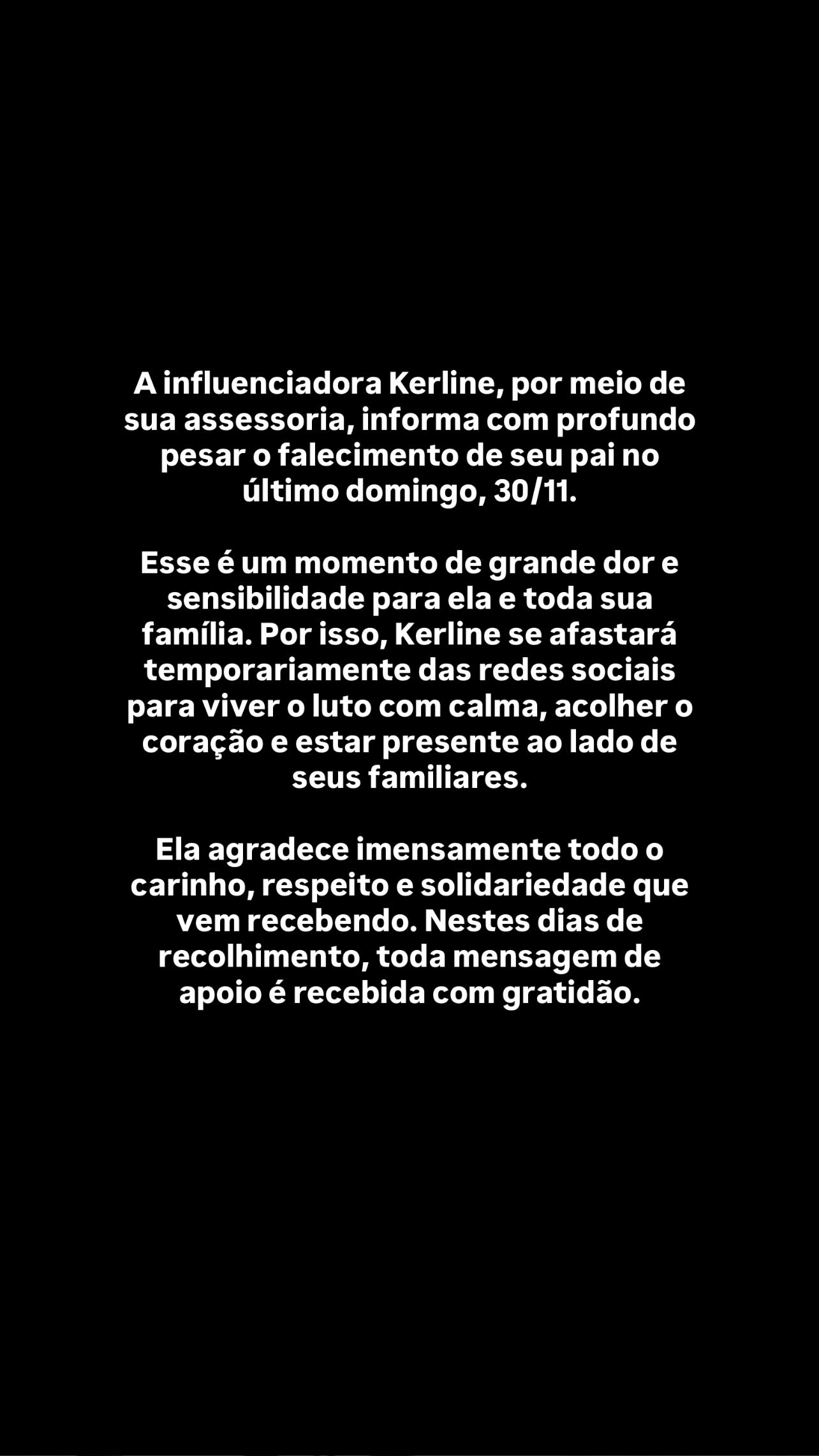 A nota, publicada nos stories do Instagram, confirma que o pai de Kerline morreu no domingo (30/11). “A influenciadora Kerline, por meio de sua assessoria, informa com profundo pesar o falecimento de seu pai no último domingo”, diz o comunicado.