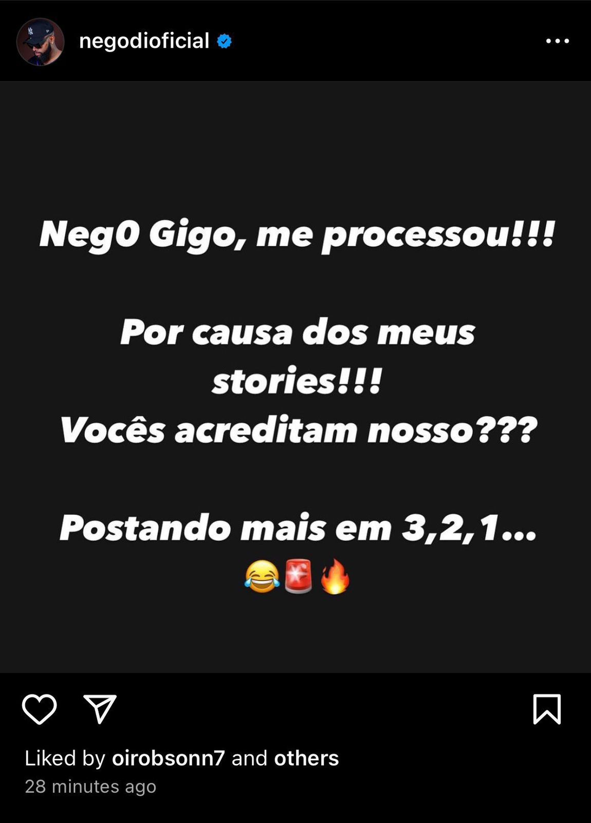 O ex-BBB Nego Di revelou neste sábado (20) que foi processado após chamar Davi Brito de ''gigolô'. Através dos Stories, ele debochou da situação: ''Nego Gigo me processou por causa dos meus Stories. ''Será se o gigolô vai entrar para o grupo seleto de pessoas que tiveram a honra de me olhar face to face na frente de um juiz?'', acrescentou.