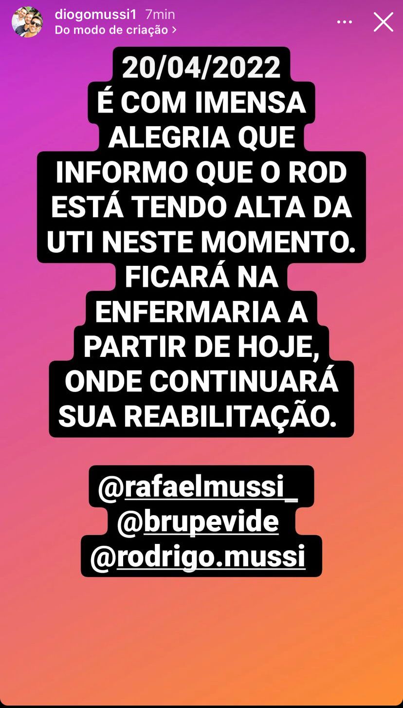 ''É com imensa alegria que informo que o Rod está tendo alta da UTI neste momento. Ficará na enfermaria a partir de hoje, onde continuará sua reabilitação'', escreveu Diogo.